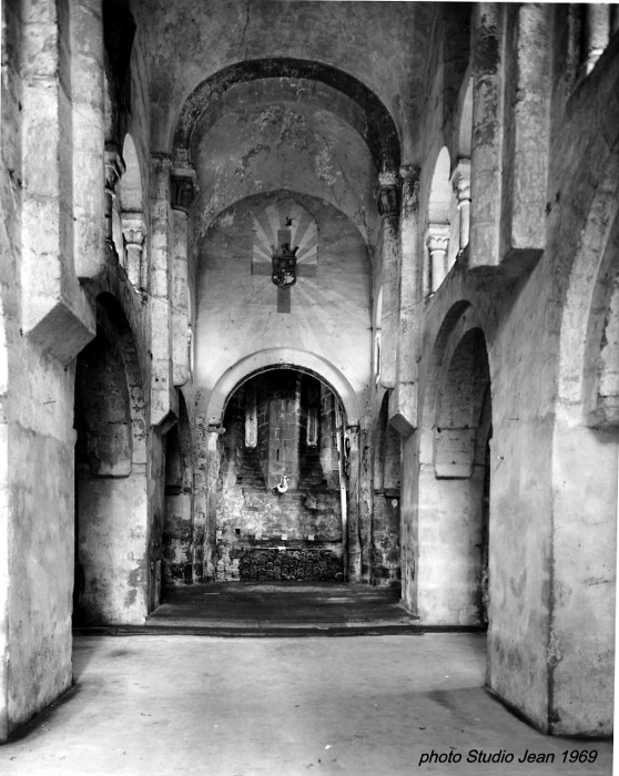 The naveSt John the Baptist church consists of a principal nave of three bays, bordered by two side-aisles which continue into the choir-bay and a semi-circular apse. As distinct from the majority of Romanesque churches, the bell-tower is not above the crossing of the transept (which does not feature in this church) but over the apse. It is very slender and reinforced by four buttresses, and with rectangular openings, but only at the upper level.