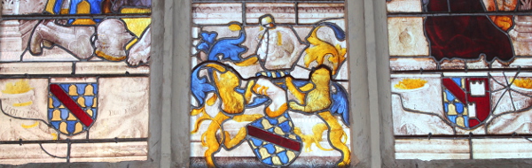 Charles de Saillant and CharlemagneFrom the 15th century, it became the custom for donors to the church (lords, senior members of the church) to have themselves represented kneeling in the stained glass windows which they were financing. The stained glass testifies simultaneously to their generosity and to their piety. At Chassy (in the canton of Guegnon) the lord's private chapel is still decorated with stained glass (15th century) which has the same characteristics.